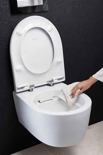 Inovativna tehnologija pretoka vodeRimfree® Posebno oblikovan razdelilnik vode po obodu WC-školjke ustvari vodni curek s tlakom, ki je višji kot pri običajnih školjkah, kar omogoča mnogo učinkovitejše splakovanje kot kadar koli doslej. Pri tem pa ste lahko brez skrbi, saj curki vode zaradi premišljene oblike tečejo le po notranjosti školjke, ne pa ven.