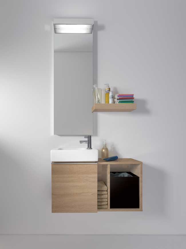 NASVET: V manjših kopalnicah prostor funkcionalno izkoristimo z visokimi omaricami z ogledalom, regali in omaricami pod umivalniki. Ozke kopalnice najbolj optimalno opremimo s kotnimi umivalniki in z omaricami z nizkimi vgradnimi globinami, ki nudijo veliko uporabnega prostora za shranjevanje. Z izbiro omaric pod umivalniki, visokih omaric, omar z ogledali in inovativnimi rešitvami za police so kopalniška keramika in pohištvo Geberit izvrstna rešitev za vsako kopalnico, saj nudijo brezmejne možnosti arhitekturnih rešitev.