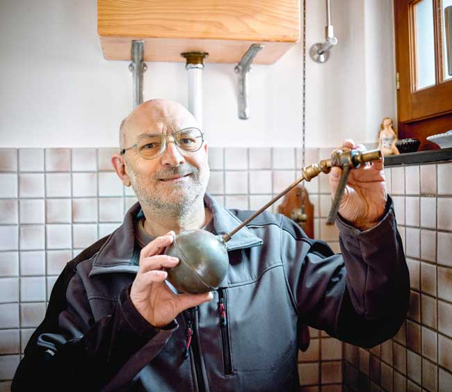 Vodovodni inštalater Paul Bosshard ima star Geberitov plavajoči ventil še vedno pri roki kot rezervni del.