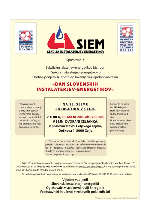Vidimo se torej na sejmu ENERGETIKA, v torek 18. 5.2010, na »dnevu slovenskih instalaterjev-energetikov« (program na 8. strani) in na razstavnem prostoru SIEM v Hali D!
